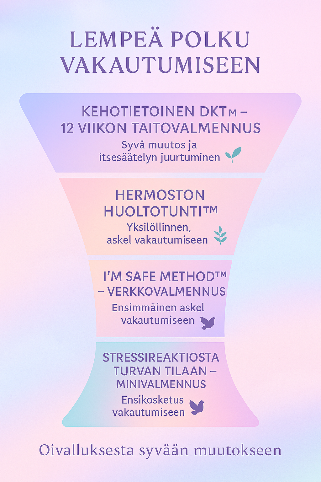 Verkkokaupan lisäksi tarjoan konkreettisia palveluita ja valmennuksia, joissa tieto muuttuu keholliseksi taidoksi – askel kerrallaan.